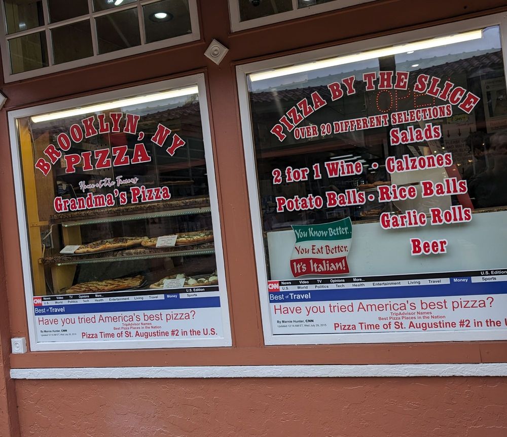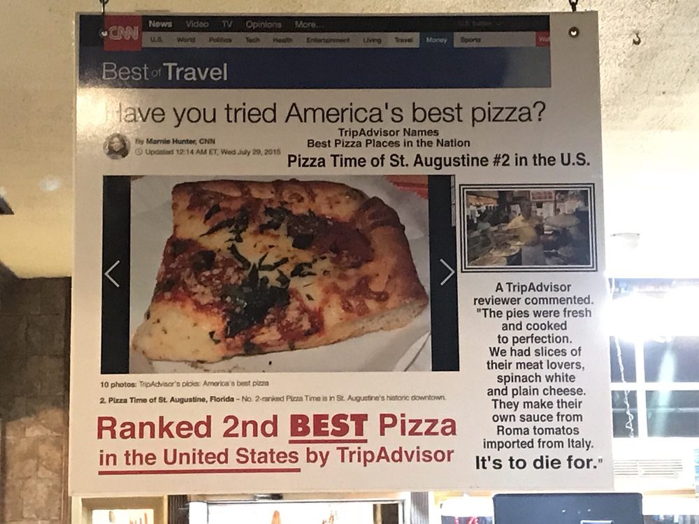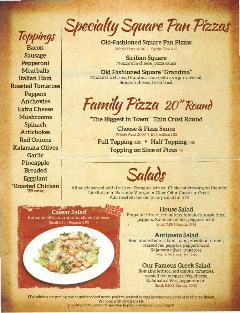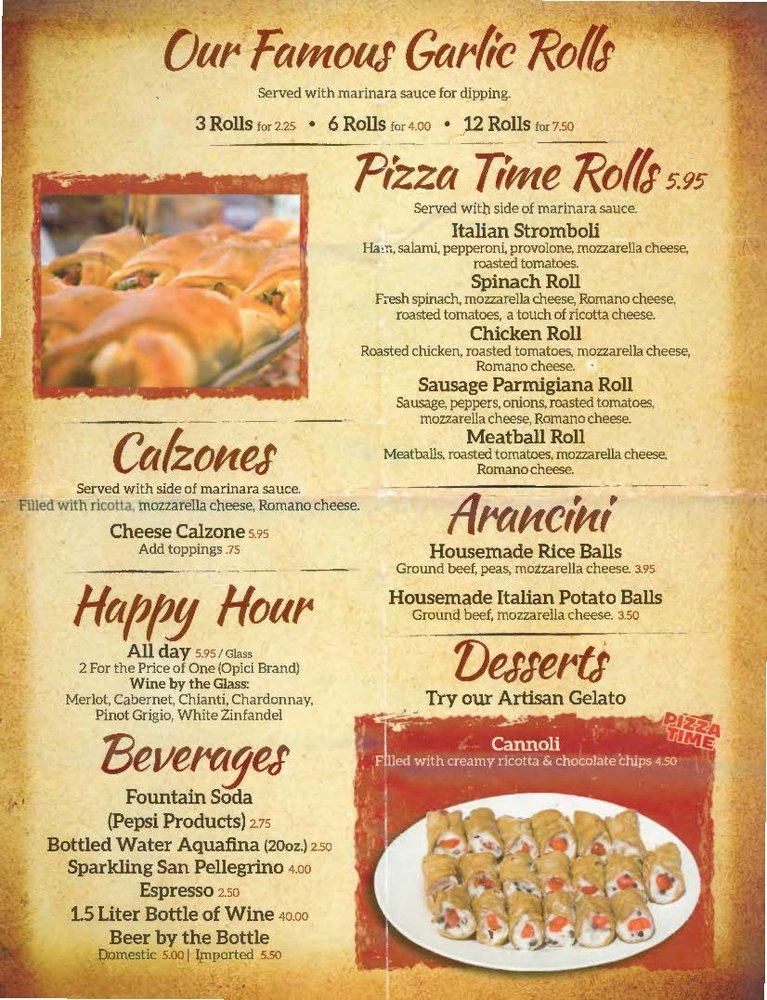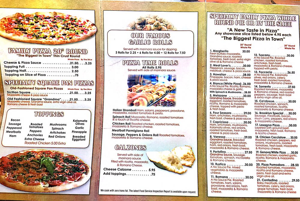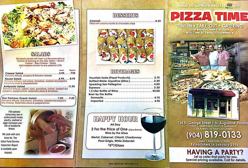 Introducing the menu at Pizza Time, located in St. Augustine, FL, offers a wide range of pizza options, garlic rolls, calzones, potato balls, sodas, and a selection of wines. Customers rave about the freshness and flavor of the pizzas, with a particular mention of the mouthwatering cheese pull. The Grandma's pizza and garlic rolls come highly recommended for their crispy yet fresh ingredients. The menu boasts many vegetarian options, making it a great choice for those with dietary restrictions. The casual atmosphere, friendly staff, and quick service make it an ideal spot for a casual lunch or dinner. While prices may be a bit on the higher side, the quality and taste of the dishes more than make up for it. Whether dining in or grabbing a slice to go, Pizza Time is a must-visit for pizza lovers.
